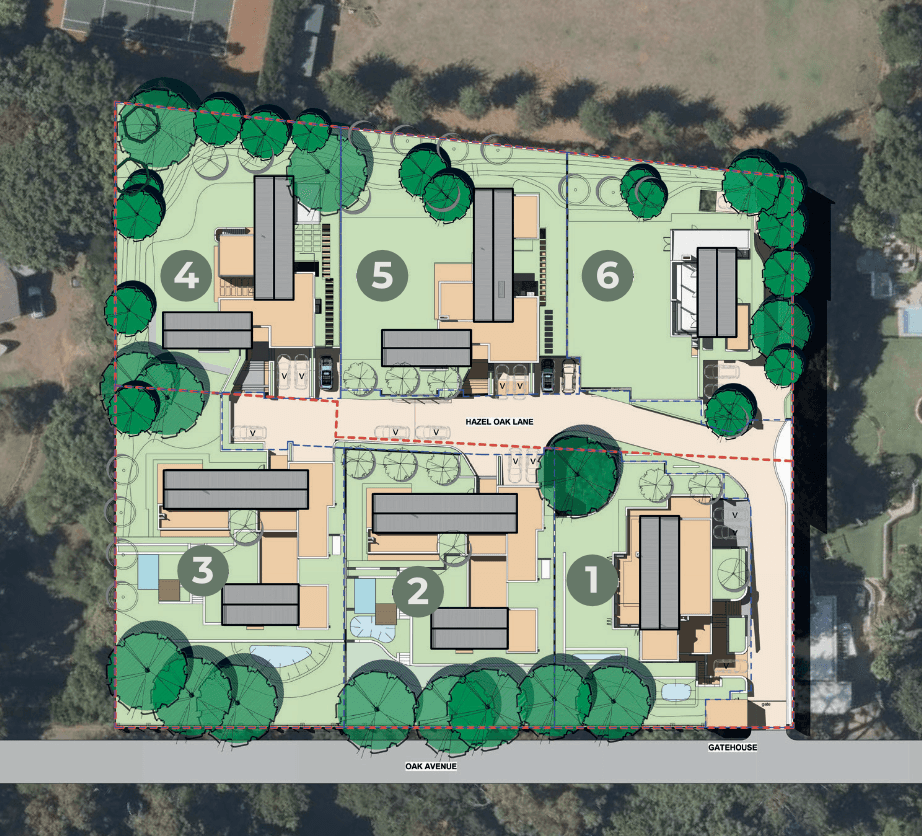 The six homes are carefully positioned along a central private lane, Hazel Oak Lane, to create a village-like sense of community and privacy.